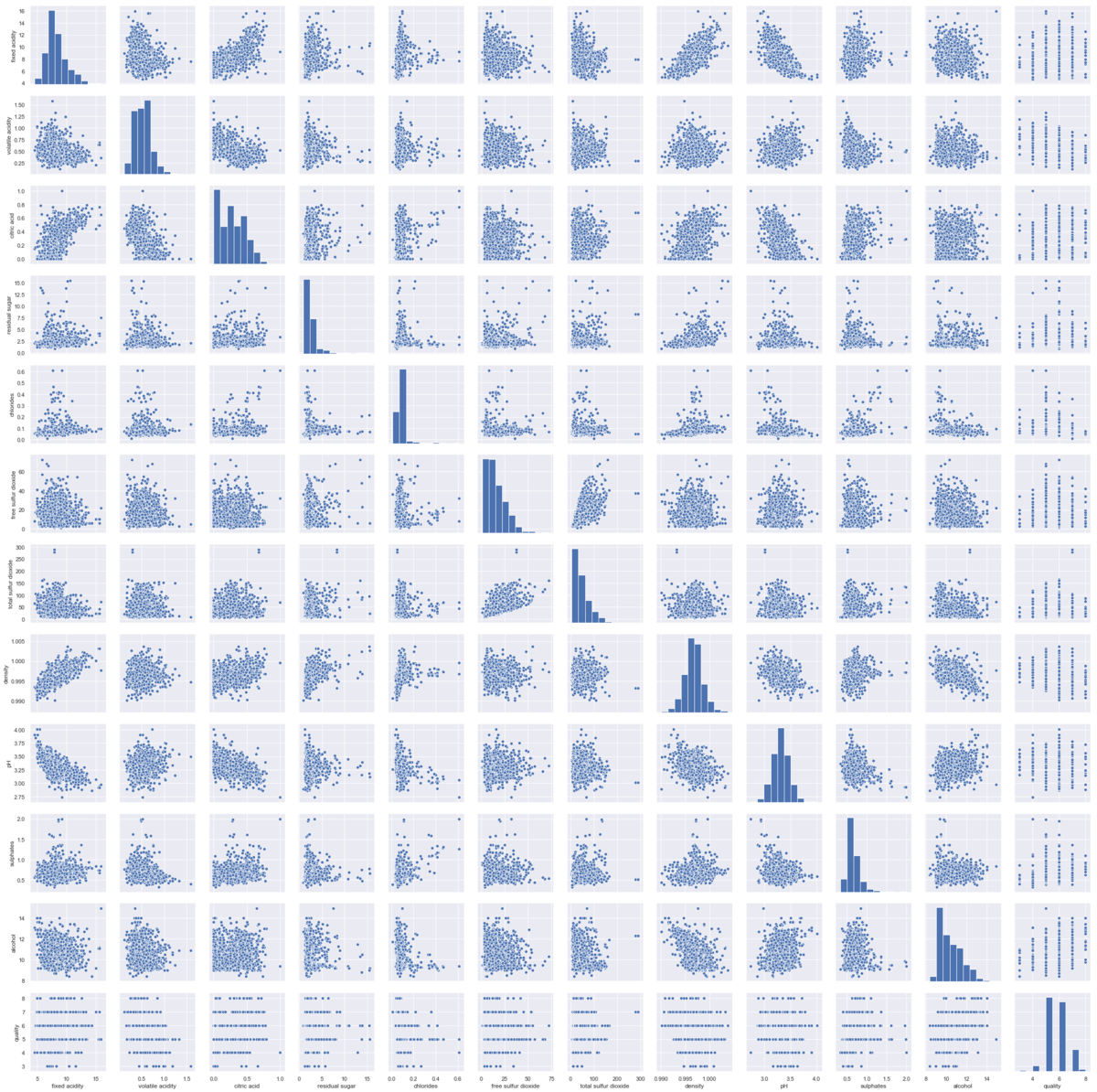 酒石酸濃度、酢酸濃度、クエン酸濃度、残留糖濃度、塩化物濃度、有利亜硫酸濃度、亜硫酸濃度、密度、pH、硫酸塩濃度、アルコール度数、quality(総合的な品質)